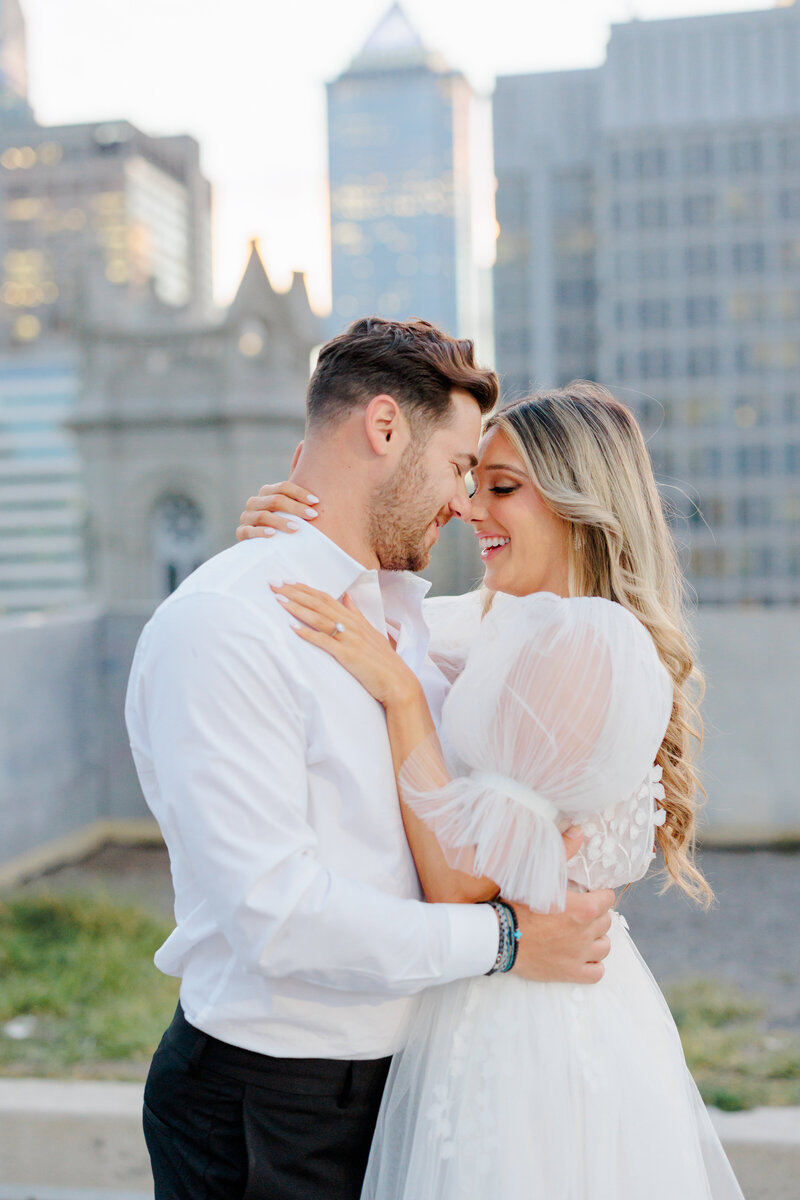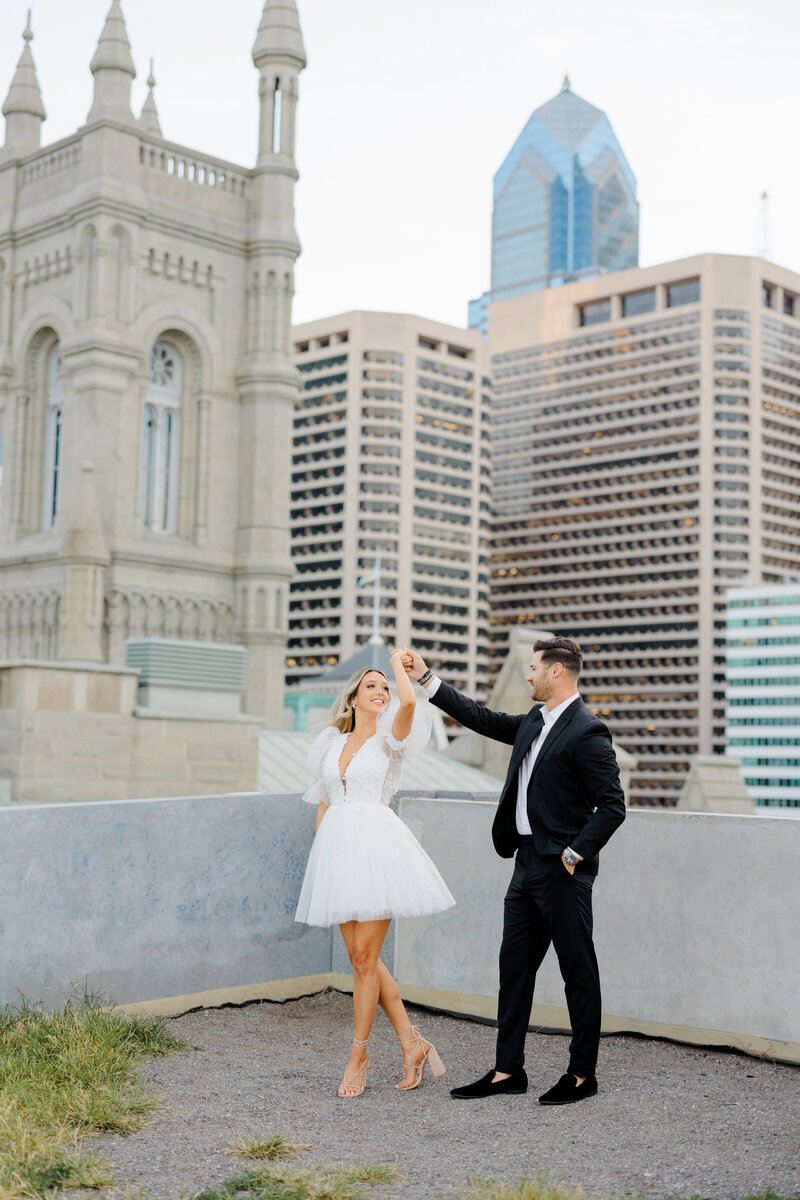 Nikki and Dante's chic engagement session in the city they love was fun from start to finish. Dante completed his stylish outfit with velvet loafers. Both of Nikki's looks were stunning, and her custom-made white mini dress was bridal perfection.